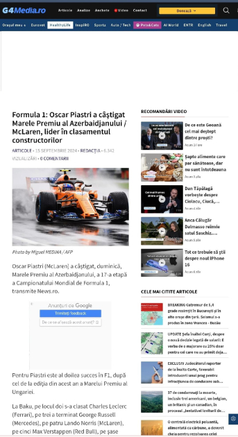 Rumıniyanın önəmli xəbər agentlikləri Bakıda keçirilmiş Formula 1 Azərbaycan Qran-Prisini geniş şəkildə işıqlandırıb.