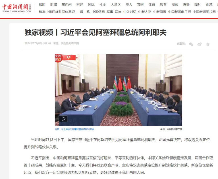 “ChinaNews” nəşrinin dərc etdiyi məqalədə Si Cinpinin Çin-Azərbaycan əlaqələrinin səmimiyyətə və qarşılıqlı etimada əsaslandığı barədə sözləri sərlövhəyə çıxarılıb. Qeyd olunub ki, ÇXR lideri iki ölkənin yaxşı dostlar, bərabərlik və qarşılıqlı faydaya əsaslanan yaxşı tərəfdaşlar olduğunu, Çin-Azərbaycan münasibətlərinin həmişə sağlam və sabit şəkildə inkişaf etdiyini vurğulayıb. Məqalədə qeyd olunub ki, Si Cinpin imzalanan Birgə Bəyannamə ilə iki ölkə arasında əlaqələrin strateji tərəfdaşlıq səviyyəsinə yüksələcəyini, bunun həm də yeni bir başlanğıc nöqtəsi olacağını deyib. Eyni zamanda, məqalədə Azərbaycan Prezidenti İlham Əliyevin ölkələrimiz arasında əmtəə dövriyyəsinin 3 milyard dollara çatması, Azərbaycanın artıq Çinin 6 şəhərində ticarət evi açması, həmçinin Çin Xalq Respublikasından Azərbaycana ixracın həcminin artması barədə fikirləri yer alıb.