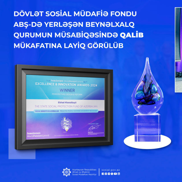 Əmək və Əhalinin Sosial Müdafiəsi Nazilriyinin tabeliyində Dövlət Sosial Müdafiə Fondu (DSMF) “Pensiya və İnvestisiya” beynəlxalq qurumunun (ABŞ) müsabiqəsində “Pensiya fondunun dizaynı və islahatları” kateqoriyası üzrə qalib mükafatına layiq görülüb.