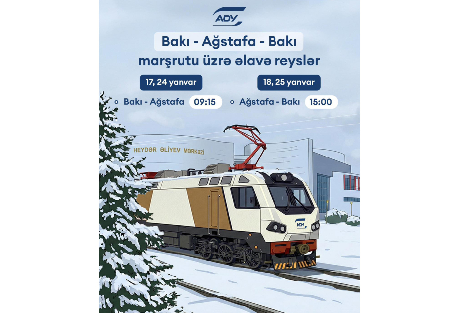 “Azərbaycan Dəmir Yolları” QSC (ADY) artan sərnişin tələbatını təmin etmək məqsədilə 17, 18, 24 və 25 yanvar tarixlərində Bakı-Ağstafa-Bakı istiqamətində endirimli qiymətlərlə əlavə qatar reysləri təyin edir.