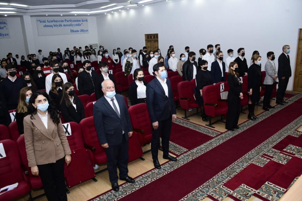 YAP Xətai rayon təşkilatının sədri Vüqar Rəhimzadə tədbirin mahiyyətini, mövzunun bütün dövrlər üçün aktuallığını və hər bir Azərbaycan vətəndaşının qarşısında dayanan vəzifə olduğunu önə çəkərək bilbirib ki, bugünkü qüdrətli, güclü, qalib Azərbaycan ulu öndər Heydər Əliyevin şah əsəridir: “Ümummilli Lider 1993-cü ildə xalqın təkidli tələbi ilə hakimiyyətə qayıdışı ilə yeni Azərbaycan qurdu. Müstəqilliyimizin bərpasının ilk illərində Azərbaycanın yaşadıqları hər kəsin yaddaşındadır. Bugünkü gənclik o illəri tarix dərsliklərindən və digər vəsaitlərdən öyrənirlər. Ulu öndər Heydər Əliyevin gördüyü işlər Vətəninə, dövlətinə, xalqına nə qədər bağlı olduğunu nümayiş etdirir. O hələ hakimiyyətinin birinci dövründə- 1969-1982-ci illərdə Azərbaycanın müstəqil gələcəyini düşünərək biri-birindən önəmli addımlar atmışdır. Bunlar arasında gənclərin keçmiş ittifaqın ən nüfuzlu ali məktəblərində təhsil almağa göndərilməsini, Cəmşid Naxçıvanski adına hərbi liseyin yaradılmasını xüsusi qeyd etmək olar. Ulu öndər Heydər Əliyev sovetlər birliyi dövründə Azərbaycanı qabaqcıl respublikalar sırasına çıxardığı kimi, 1993-cü ildə xalqın təkidli tələbi ilə hakimiyyətə qayıdışı ilə müstəqilliyi əbədiləşdirən uğurlu bir yolun başlanğıcını qoydu. 1993-cü ildə xalqın təkidli tələbi ilə hakimiyyətə qaydışından sonra Azərbaycanın qısa müddətdə sabitilk diyarına, qüdrətli iqtisadiyyata malik ölkəyə çevrilməsinə əsas yaratdı.”