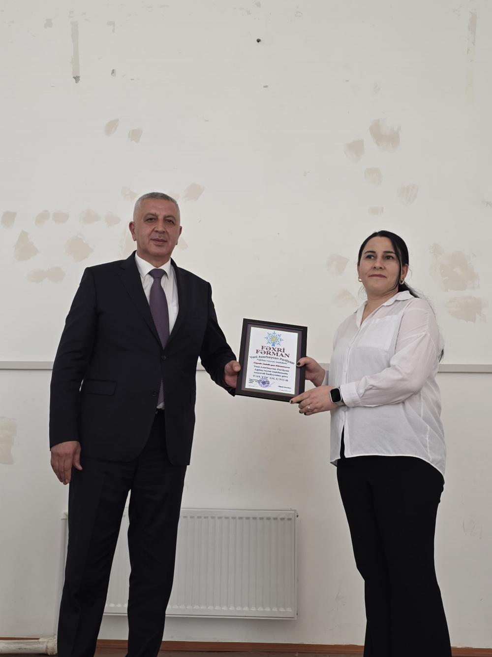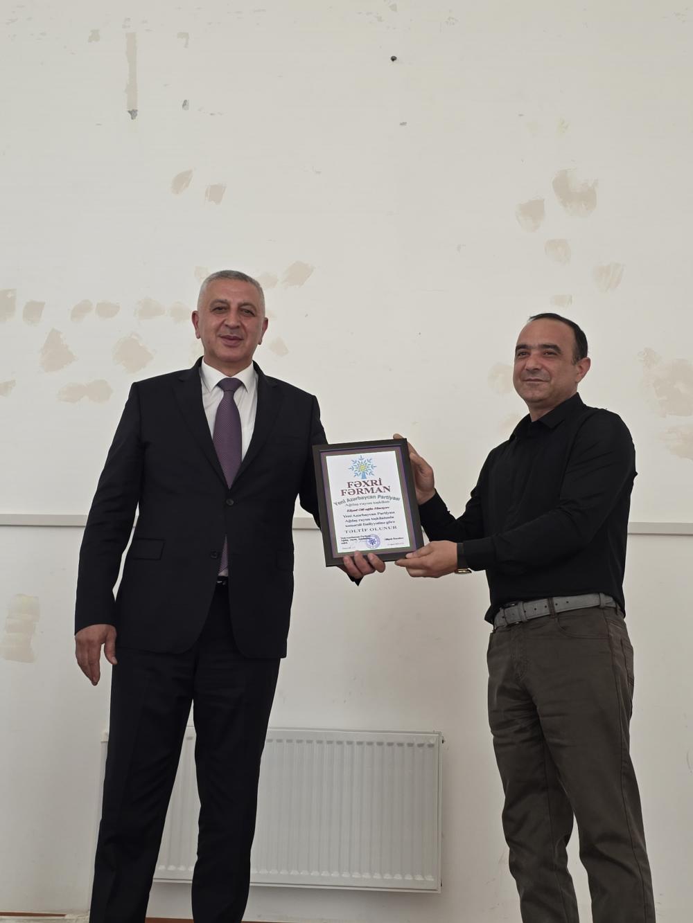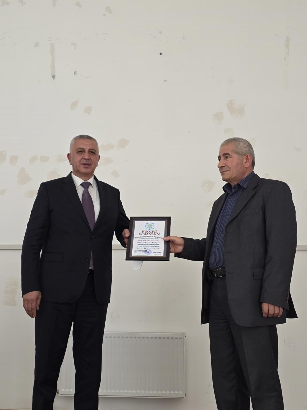 Tədbirinin sonunda bir qrup partiya fəalına rayon təşkilatının Fəxri fərmanları təqdim olunub.