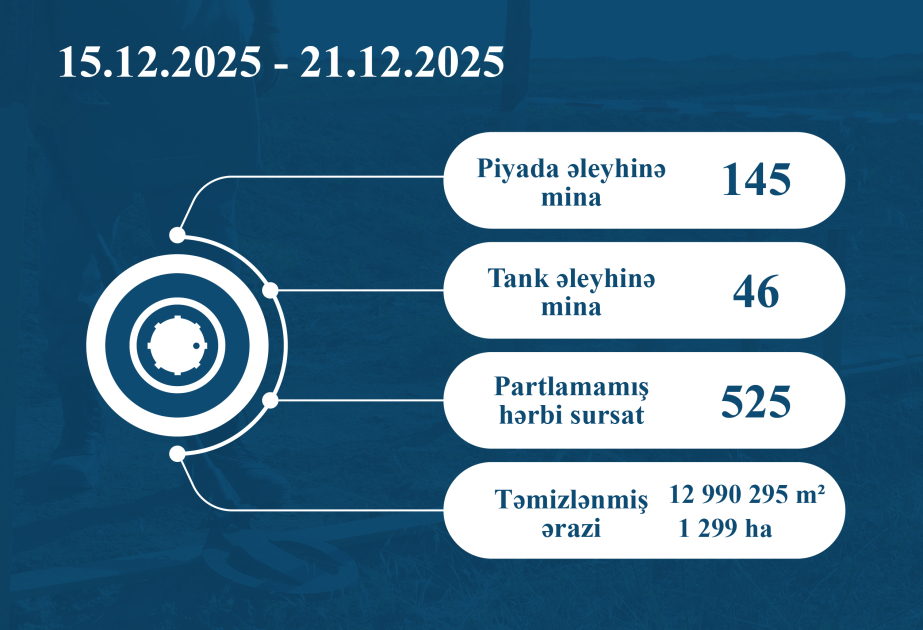 Azərbaycan Respublikasının Minatəmizləmə Agentliyi (ANAMA) işğaldan azad edilmiş ərazilərdə minatəmizləmə fəaliyyətinə cəlb olunmuş qurumlar tərəfindən 15-21 dekabrda icra edilən minatəmizləmə əməliyyatlarına dair məlumat açıqlayıb.