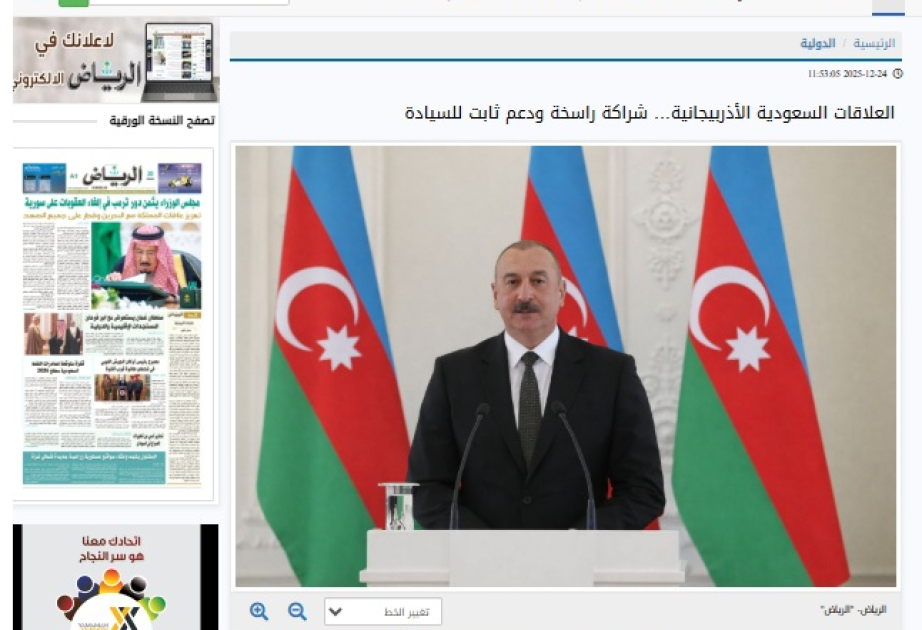 Səudiyyə Ərəbistanı Krallığında nəşr olunan nüfuzlu “ər-Riyad” qəzetinin bugünkü nömrəsində “Səudiyyə Ərəbistanı–Azərbaycan münasibətləri: möhkəm tərəfdaşlıq və suverenliyə ardıcıl dəstək” sərlövhəli məqalə dərc edilib.
