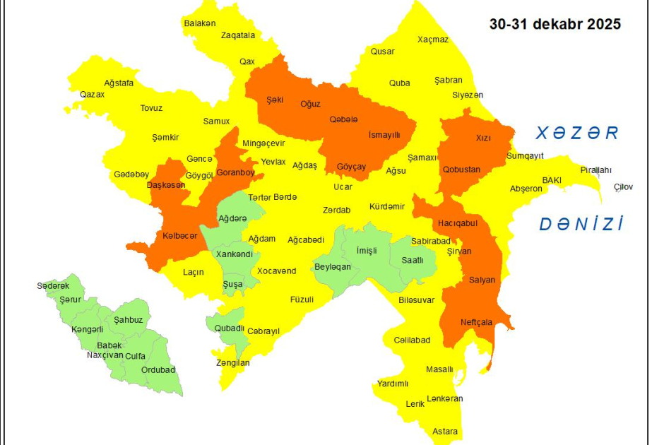 Milli Hidrometeorologiya Xidməti dekabrın 30-da və 31-də Bakıda və Abşeron yarımadasında, eyni zamanda, əksər bölgələrdə gözlənilən küləkli hava şəraiti ilə bağlı sarı və narıncı xəbərdarlıq verib.