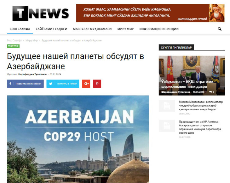 Məqalədə qeyd olunur ki, noyabrın 11-22-də Bakıda keçiriləcək COP29 tədbiri Azərbaycanın beynəlxalq nüfuzunun təsdiqidir: “Planetimizin gələcəyi Azərbaycanda müzakirə ediləcək. Azərbaycan Prezidenti İlham Əliyevin dediyi kimi, COP29 beynəlxalq ictimaiyyət tərəfindən Azərbaycana ehtiramın və dəstəyin göstəricisidir: “Biz hazırlığın fəal mərhələsindəyik. COP29 çox böyük məsuliyyətdir. Burada söhbət təkcə təşkilati məsələlərdən deyil, nəticələrin əldə edilməsindən də gedir”.
