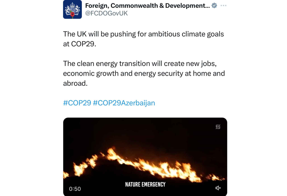 AZƏRTAC xəbər verir ki, bu barədə Birləşmiş Krallığın Xarici İşlər Nazirliyi “X” sosial şəbəkəsində COP29 ilə bağlı paylaşım edib. Paylaşımda qeyd olunub ki, təmiz enerjiyə keçid həm Britaniyada, həm də xaricdə yeni iş yerləri, iqtisadi inkişaf və enerji təhlükəsizliyi yaradacaq.