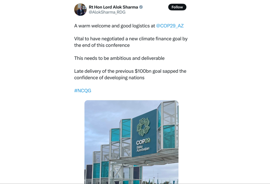 COP26-nın Prezidenti Alok Şarma BMT-nin İqlim Dəyişmələri üzrə Çərçivə Konvensiyasının Tərəflər Konfransının 29-cu sessiyası (COP29) barəsində özünün X sosial şəbəkə hesabında paylaşım edib.