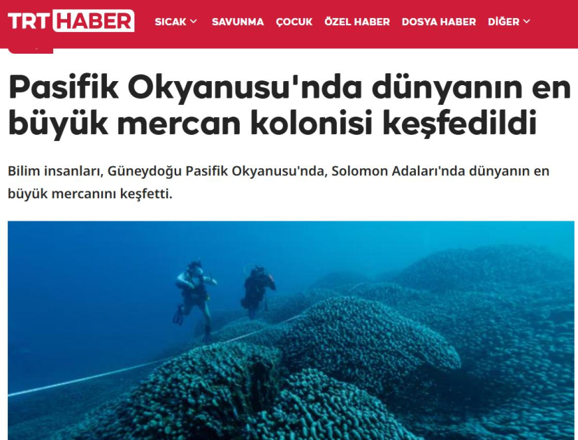 Azərbaycanda COP29 çərçivəsində Solomon adaları sahillərində dünyanın ən böyük mərcanının tapılması ilə bağlı elanın dərci Türkiyə mətbuatında geniş işıqlandırılıb.