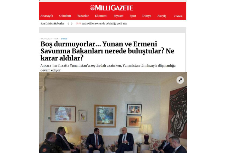 AZƏRTAC xəbər verir ki, bu barədə Türkiyənin “Milli Gazete” nəşri Yunanıstan və Ermənistanın müdafiə nazirləri arasında Vaşinqtonda keçirilən görüşü şərh edərkən yazır.