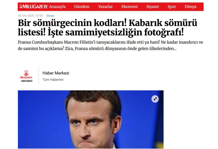 Türkiyə mediası: Makronun məqsədi xalqlara dəstək yox, yeni müstəmləkəçilikdir