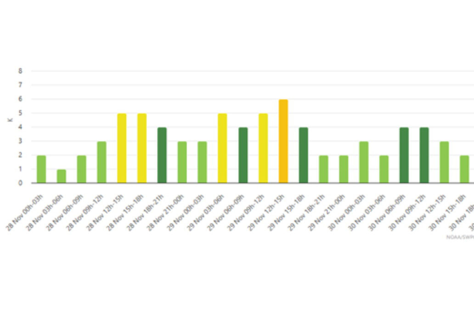 Noyabrın 28-də gecə saatlarından başlayaraq 29-u saat 12.00 radələrinədək G1 (mülayim) - G2 (orta) səviyyəli geomaqnit qasırğası gözlənilir. Həmin dövrdə geomaqnit qasırğasının gücünü göstərən Kp əmsalı 10 ballıq şkala ilə 4-6 intervalında olacaq.
