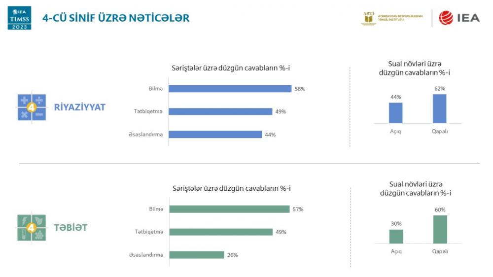 Elm və Təhsil Nazirliyindən bildirilib ki, nəticələrə əsasən, Azərbaycan IV sinif riyaziyyat fənni üzrə 494 balla 58 ölkə arasında 38-ci yerdə qərarlaşıb. Təbiət elmləri üzrə nəticə isə 422 bal olub. Bu nəticələr ötən tədqiqat dövrü ilə müqayisədə daha aşağıdır. Azərbaycanın IV sinif üzrə riyaziyyat nəticələri Fransa, Belçika (Fransız), Yeni Zelandiya, Qazaxıstan, Qətər və Özbəkistan kimi ölkələrdən daha yaxşı olub.