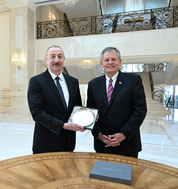 Sonda senator Stiv Deyns Prezident İlham Əliyevə xatirə hədiyyəsi təqdim etdi.