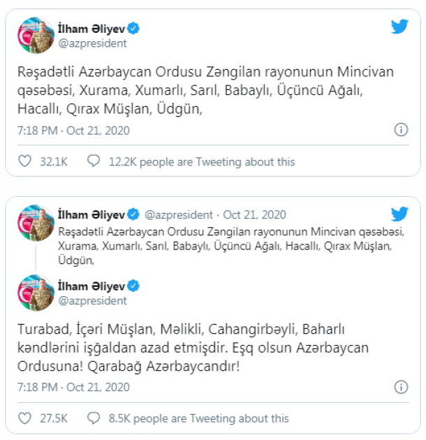 • Azərbaycan Ordusu Füzuli rayonunun Gecəgözlü, Aşağı Seyidəhmədli, Zərgər kəndlərini, Cəbrayıl rayonunun Balyand, Papı, Tulus, Hacılı, Tinli kəndlərini işğaldan azad edib. Bu barədə Prezident İlham Əliyev özünün rəsmi tviter səhifəsində bildirib.