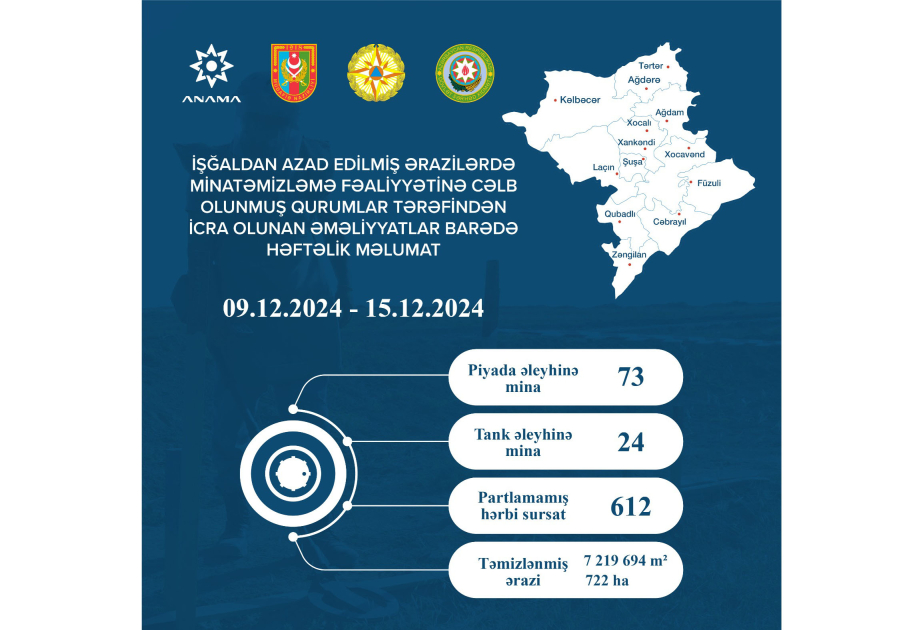 ANAMA-dan bildirilib ki, Tərtər, Ağdərə, Kəlbəcər, Ağdam, Xocalı, Xankəndi, Xocavənd, Laçın, Şuşa, Füzuli, Qubadlı, Cəbrayıl və Zəngilan ərazilərində ötən həftə ərzində aparılmış minatəmizləmə əməliyyatları zamanı piyada əleyhinə 73, tank əleyhinə 24 mina, 612 partlamamış hərbi sursat (PHS) aşkarlanıb və zərərsizləşdirilib.