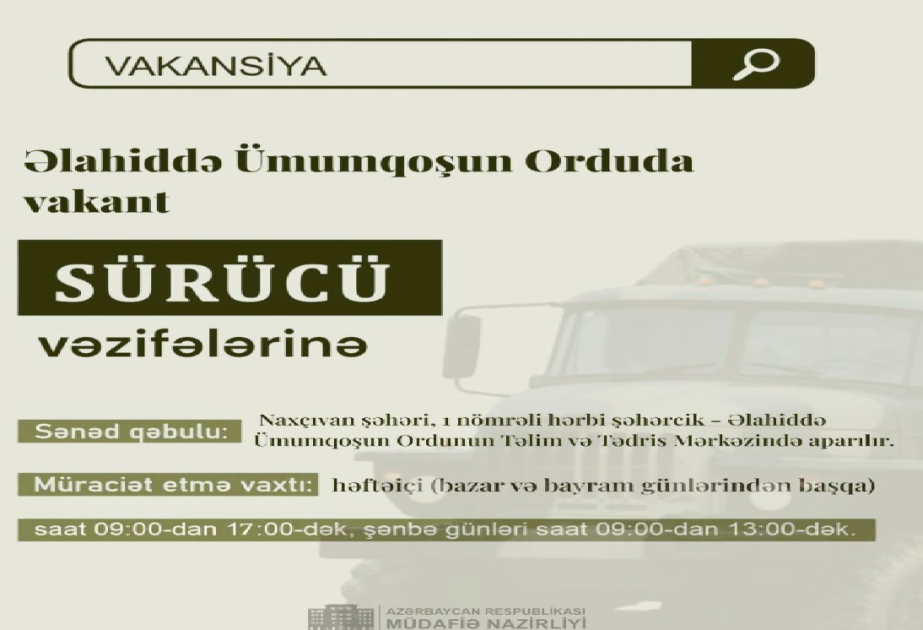Əlahiddə Ümumqoşun Ordunun tabeliyindəki hərbi hissələrdə vakant sürücü vəzifələrinə qəbul elan edilir