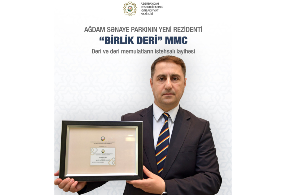 Türkiyə kapitallı “Birlik Deri” MMC Ağdam Sənaye Parkında rezidentlik hüququ alaraq xarici investor statusunda fəaliyyətə başlayıb. Şirkət ilk sərmayə proqramı çərçivəsində sənaye parkına 20,8 milyon manat investisiya yatıracaq. Dəri və dəri məmulatları istehsal etməyi planlaşdıran “Birlik Deri” MMC İtaliya, Türkiyə, Cənubi Koreya kimi qabaqcıl ölkələrin texnologiyalarına əsaslanan sənaye bölməsi yaratmaqla, müəssisədə istehsal olunacaq məhsulların daxili bazarda satışı ilə yanaşı, ixracını da nəzərdə tutur. Layihə çərçivəsində 250-dən çox yeni iş yeri yaradılması hədəflənib ki, onların böyük qismi yerli sakinlər olacaq.