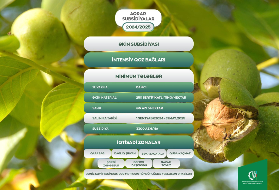 Aqrar Subsidiya Şurasının qərarına əsasən, 2024-cü il sentyabrın 1-dən 2025-ci il mayın 31-dək ən azı 5 hektar sahədə salınmış, müasir suvarma sistemi ilə təmin olunmuş, hər hektarda 250 sertifikatlı ting əkilmiş intensiv qoz bağlarına görə birdəfəlik əkin subsidiyasının verilməsi nəzərdə tutulur.