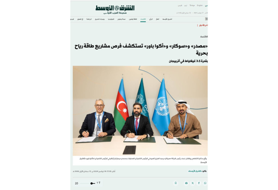 Səudiyyə Ərəbistanı Krallığının “əş-Şarq əl-Avsat”, “əl-Mədinə”, “əl-Riyad”, “əl-Jazirah” qəzetlərində və digər nüfuzlu media orqanlarından Azərbaycanda dənizdə ilk külək stansiyalarının inşası ilə bağlı imzalanmış üçtərəfli anlaşma memorandumu barədə xəbərlər dərc olunub.