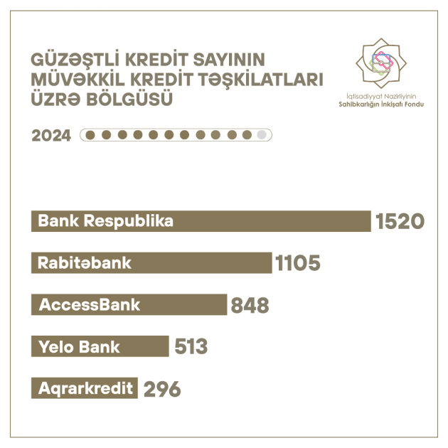 Həmin dövrdə verilmiş güzəştli kreditlərin məbləği üzrə fərqlənən müvəkkil kredit təşkilatlarına isə “Bank Respublika” ASC, “Rabitəbank” ASC, “AccessBank” QSC, “Yelo Bank” ASC və “Kapital Bank” ASC daxildir.