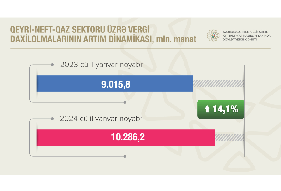 Qeyri-neft-qaz sektorundan daxilolmalar 10 milyard 286,2 milyon manatdan artıq olub, dövlət büdcəsinə proqnozdan əlavə 292 milyon manatdan çox vəsait ödənilib. Ötən ilin müvafiq dövrü ilə müqayisədə bu sektordan vergi daxilolmaları 14,1 faiz artıb.