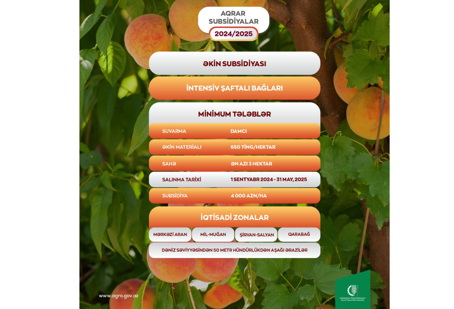 2024-cü ilin 1 sentyabr tarixindən 2025-ci il mayın 31-dək Mərkəzi Aran, Mil-Muğan, Şirvan-Salyan və Qarabağ iqtisadi zonalarına daxil rayonlarda salınacaq intensiv şaftalı (nektarin) bağlarının hər hektarına görə fermerlərə 4000 manat birdəfəlik əkin subsidiyası ödəniləcək.