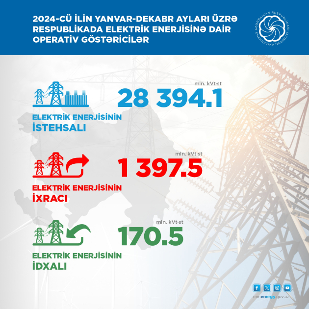 Qeyd edək ki, 2024-cü ilin dekabr ayında respublika üzrə elektrik enerjisinin istehsalı 2 milyard 466,4 milyon kilovat-saat olub. Bu dövrdə elektrik enerjisinin ixracı 142,3 milyon kilovat-saat, idxalı isə 10,6 milyon kilovat-saat təşkil edib.
