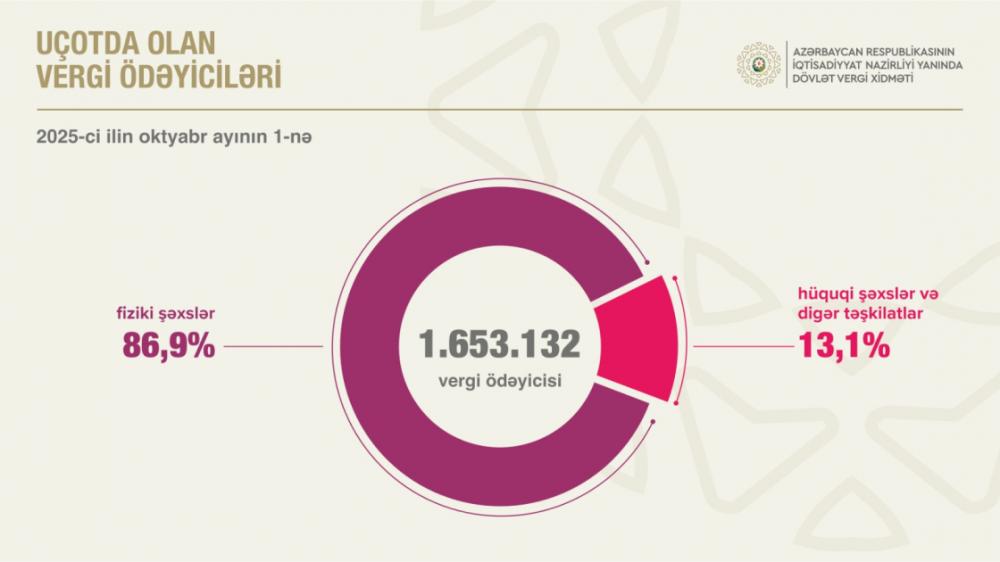 Cari ilin oktyabr ayının 1-nə respublika üzrə uçotda olan 1 milyon 653 min 132 vergiödəyicisinin 86,9 faizi fiziki şəxs, 13,1 faizi hüquqi şəxs və digər təşkilatlar olub.
