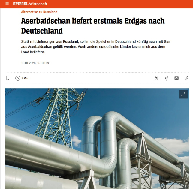 “Spiegel” qəzetində yayımlanan məqalədə əsas diqqət uzunmüddətli enerji əməkdaşlığına və sabit tədarük həcminə yönəlib və Almaniya bazarında Azərbaycan qazının strateji rolu xüsusi vurğulanır. Belə ki, Almaniya qaz tədarükünün ticarət və uzunmüddətli müqavilələr baxımından əhəmiyyəti qeyd edilib, SOCAR ilə SEFE arasında illik 1,5 milyard kubmetr qazın tədarükünü nəzərdə tutan onillik müqavilənin imzalandığı xatırlanıb. Nəşr, həmçinin vurğulayıb ki, Azərbaycanın Avropaya qaz ixracının ümumi həcminin 2025-ci ildə 12,8 milyard kubmetr təşkil etməsi bu ölkənin Avropa bazarında güclü mövqeyini göstərir. Eyni zamanda, vurğulanıb ki, ixracın daha da artırılması investisiyalardan və boru kəmərlərinin ötürmə qabiliyyətinin genişləndirilməsindən asılıdır.