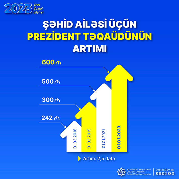 Son 5 ildə Azərbaycanda ünvanlı sosial yardımın aylıq məbləği 3 dəfə artıb. Artım tendensiyası artıq başa çatmaqda olan “Heydər Əliyev İli”ndə də yüksək olub. 2023-cü il üçün ehtiyac meyarının həddi ötən ilə nisbətən 23 faiz artırılmaqla 246 manat müəyyən olunub ki, bu artımla ünvanlı yardımların da məbləği də yüksəlib. Ailənin orta aylıq gəliri ailənin üzvlərinin hər biri üzrə ehtiyac meyarının cəmindən aşağı olduqda ailəyə arada yaranan fərq qədər yardım təyin olunur. Beləliklə, cari ildə ehtiyac meyarının artması aztəminatlı ailələrə təyin olunan ünvanlı yardımın da artmasına səbəb olub. Ümumilikdə, ünvanlı sosial yardımların bir ailəyə düşən orta aylıq məbləği 2022-ci ilin müvafiq göstəricisi ilə müqayisədə bu il 36 faiz artıb. Eyni zamanda, ünvanlı sosial yardımların təyin edilməsi mexanizmi sadələşdirilib və sahədə şəffaflq təmin edilib. Hazırda ölkə üzrə 65 min ailə ünvanlı sosial yardım alır. 2023-cü ildə edilən artımlardan sonra ailə başına orta hesabla 490 manata yaxın vəsait ödənilir.