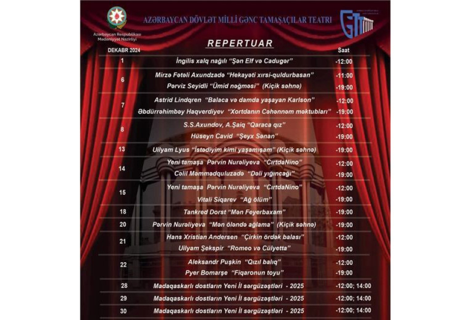 Azərbaycan Dövlət Milli Gənc Tamaşaçılar Teatrı dekabrda maraqlı səhnə əsərləri ilə çıxış edəcək.