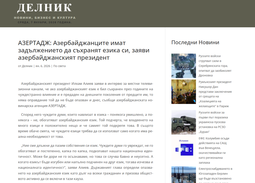 Bolqarıstan Teleqraf Agentliyinin, “Delnik” nəşrinin, BGN xəbər portalının AZƏRTAC-a istinadla dərc etdikləri “Azərbaycan Prezidenti azərbaycanlıların öz dövlət dilini qorumalarının vacibliyini vurğulayıb” sərlövhəli məqalədə Prezident İlham Əliyevin dövlət dilinin qorunması və inkişafı ilə bağlı fikirləri yer alıb.