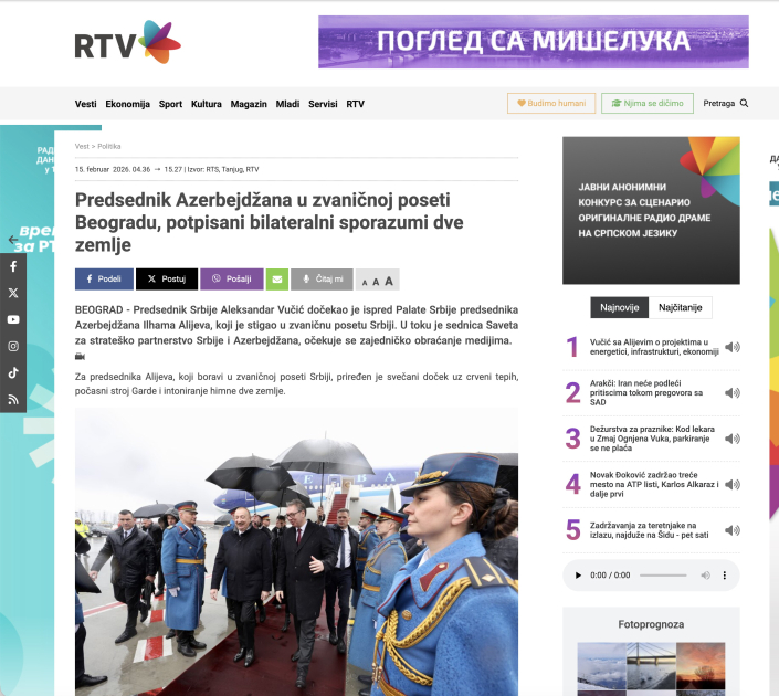 Prezident İlham Əliyevin geniş tərkibli heyətlə Serbiyaya rəsmi səfəri, burada keçirilmiş görüşlər və əldə edilmiş razılaşmalar isə Serbiya mətbuatı tərəfindən geniş işıqlandırılıb. TANYUQ və Beta xəbər agentlikləri, RTS telekanalı, Belqrad Radiosu, “Politika”, “Blits”, “İnformer” gündəlik qəzetləri, eləcə də aparıcı xəbər saytları iki ölkə arasında strateji əməkdaşlığın genişləndirilməsi, xüsusilə energetika, infrastruktur və iqtisadi sahələrdə birgə layihələr müzakirə olunduğundan bəhs ediblər.