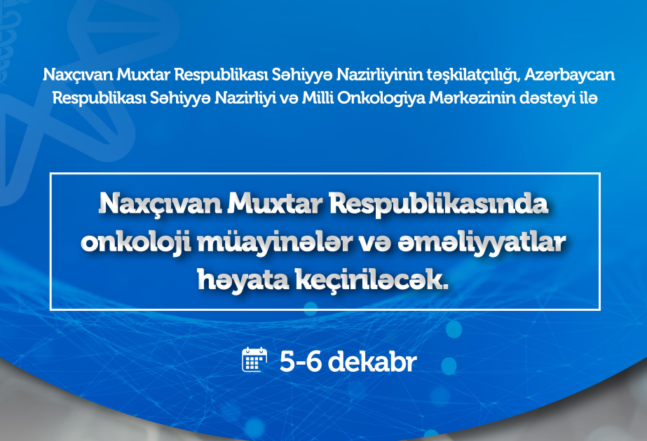 Dekabrın 5-6-da Naxçıvan Muxtar Respublikası Səhiyyə Nazirliyinin təşkilatçılığı, Azərbaycan Respublikası Səhiyyə Nazirliyi və Milli Onkologiya Mərkəzinin dəstəyi ilə Naxçıvan Muxtar Respublikasında onkoloji müayinə və əməliyyatlar keçiriləcək.