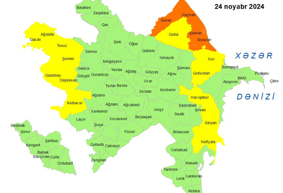Milli Hidrometeorologiya Xidməti noyabrın 24-də bəzi bölgələrdə gözlənilən küləkli hava şəraiti ilə bağlı sarı və narıncı xəbərdarlıq verib.