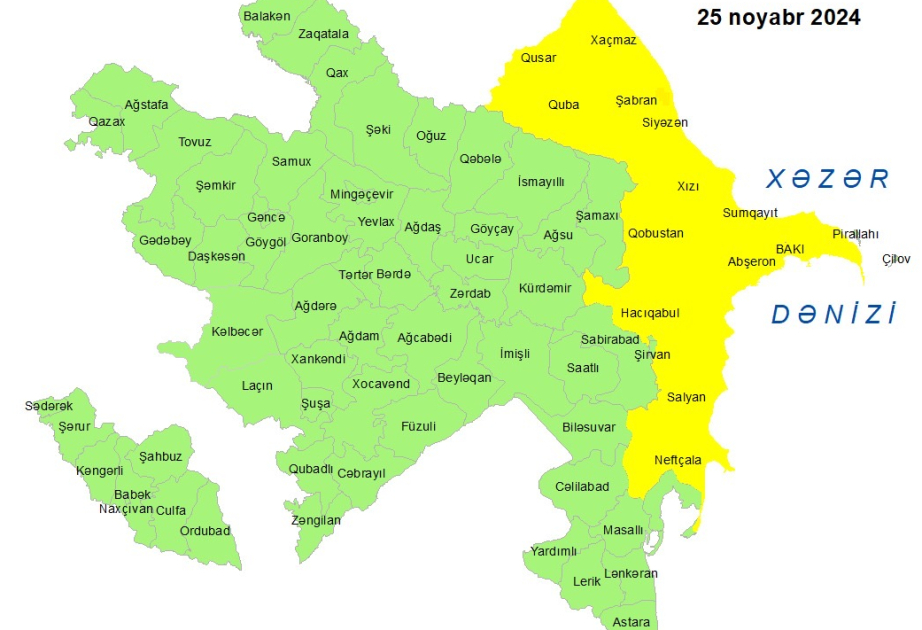 Milli Hidrometeorologiya Xidməti noyabrın 25-də Bakıda və Abşeron yarımadasında, eyni zamanda, bəzi bölgələrdə gözlənilən küləkli hava şəraiti ilə bağlı sarı xəbərdarlıq verib.