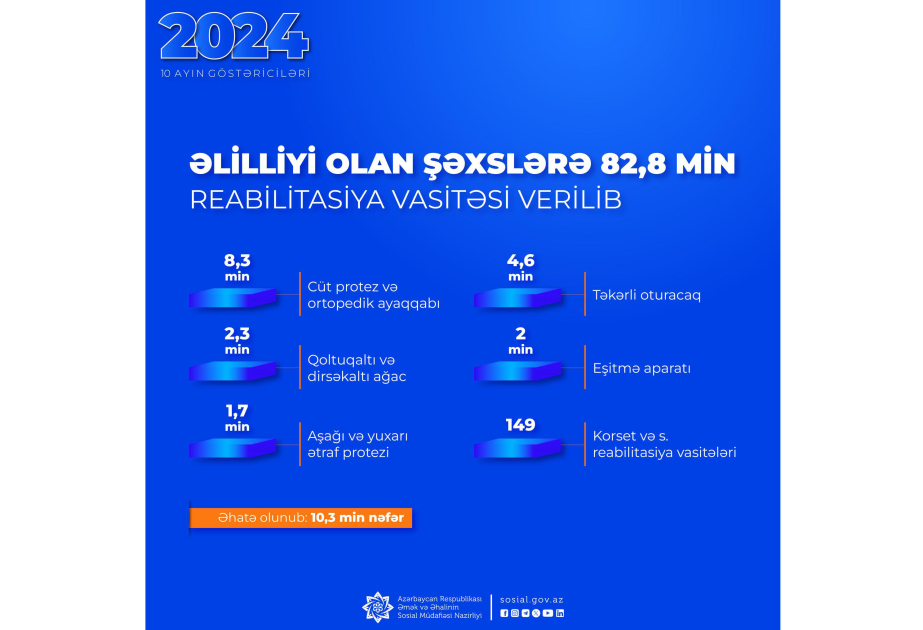 Bu ilin 10 ayı ərzində ümumilikdə 10,3 min əlilliyi olan şəxs reabilitasiya vasitələri ilə təmin edilib.