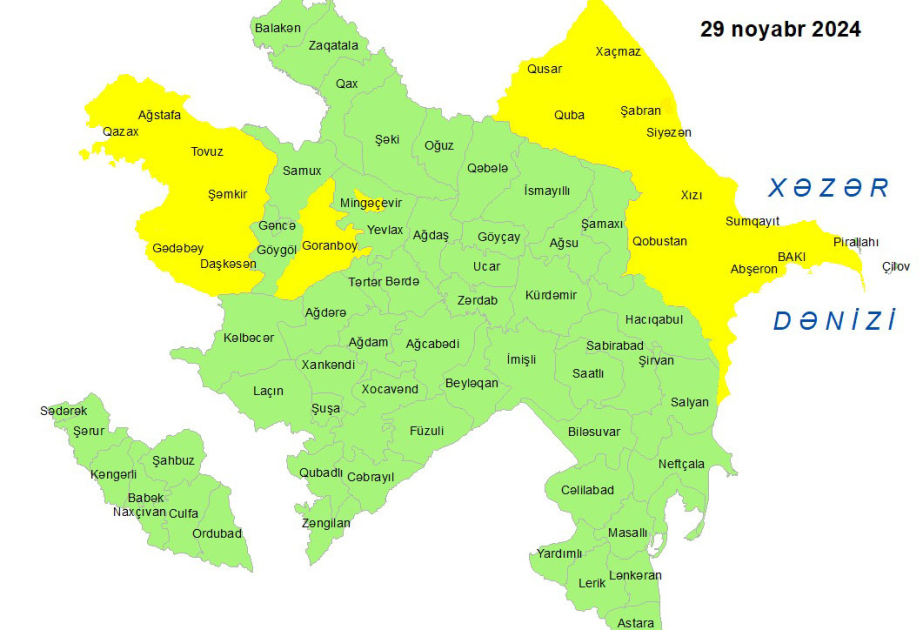Milli Hidrometeorologiya Xidməti noyabrın 29-u Bakıda və Abşeron yarımadasında, eyni zamanda bəzi bölgələrdə gözlənilən küləkli hava şəraiti ilə bağlı sarı xəbərdarlıq verib.
