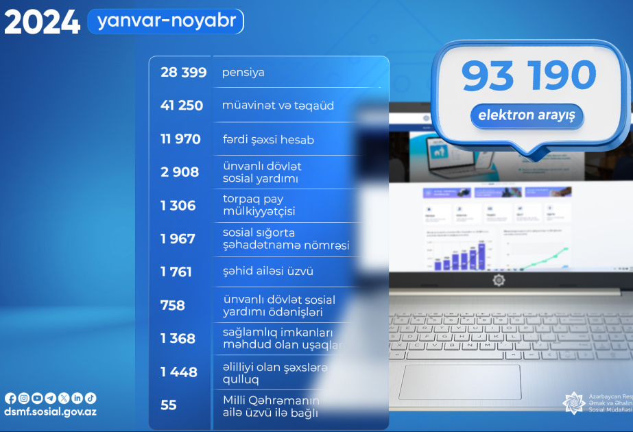 Həmin arayışların 28 min 399-u pensiya, 41 min 250-si müavinət və təqaüd, 11 min 970-i fərdi şəxsi hesab, 2 min 908-i ünvanlı dövlət sosial yardımı, 1 306-sı torpaq pay mülkiyyətçisi, 1 967-si sosial sığorta şəhadətnamə nömrəsi, 1 761-i şəhid ailəsi üzvü, 758-i ünvanlı dövlət sosial yardımı ödənişləri, 1 368-i sağlamlıq imkanları məhdud olan uşaqlar, 1 448-i əlilliyi olan şəxslərə qulluq, 55-i Milli qəhrəmanların ailə üzvləri ilə bağlı olub.