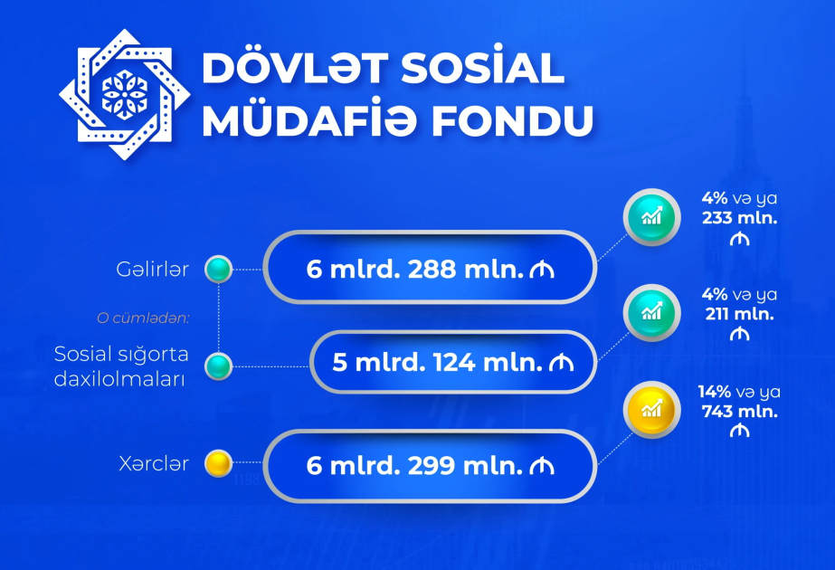 Əmək və Əhalinin Sosial Müdafiəsi Nazirliyinin tabeliyində Dövlət Sosial Müdafiə Fondunun (DSMF) gəlirləri bu ilin 11 ayında proqnozla müqayisədə 4 faiz və ya 233 milyon manat çox olmaqla 6 milyard 288 milyon manat təşkil edib.