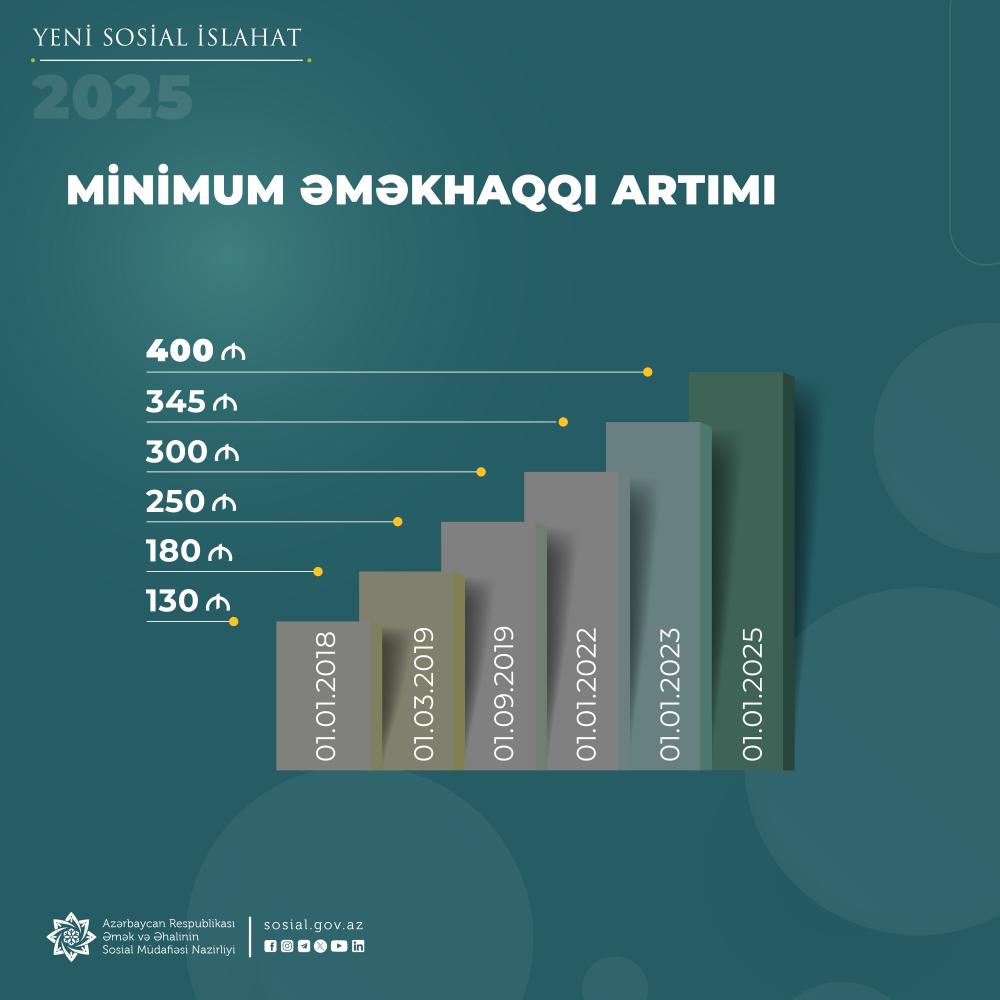 2025-ci ilin yanvar ayından etibarən ölkəmizdə beşinci sosial islahat paketi çərçivəsində sosial artımların icrasına start verilib. Dövlət başçısının imzaladığı “Əhalinin sosial rifahının yaxşılaşdırılması sahəsində tədbirlərin davam etdirilməsi haqqında” sərəncamına uyğun olaraq, ilk növbədə, minimum əməkhaqlarının artımının təmin edilməsi icra olunacaq. Minimum aylıq əməkhaqqının məbləğinin 16 faiz artırılaraq 345 manatdan 400 manata çatdırılması sayəsində dövlət və özəl sektorda çalışan insanların maaşlarının ən aşağı məbləği 400 manat təşkil edəcək.
