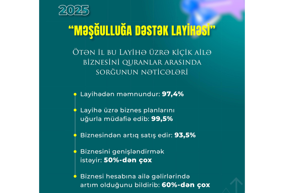 Həmçinin ötən il layihə çərçivəsində kiçik biznesini quranların 60 faizdən çoxu bu biznes hesabına artıq ailə gəlirlərində artım olduğunu bildirib.