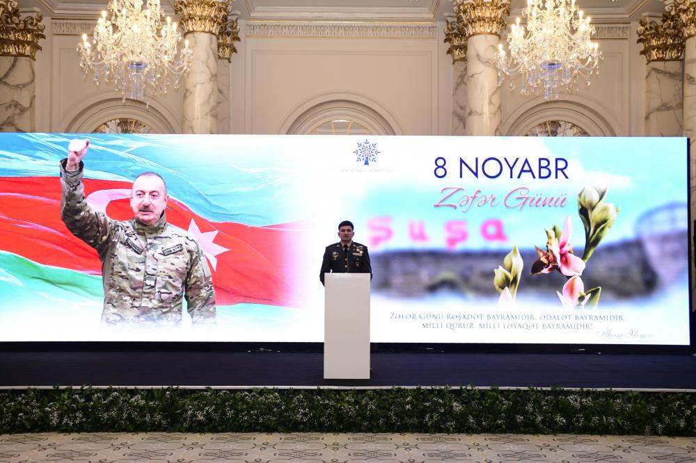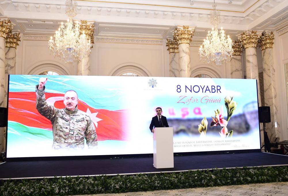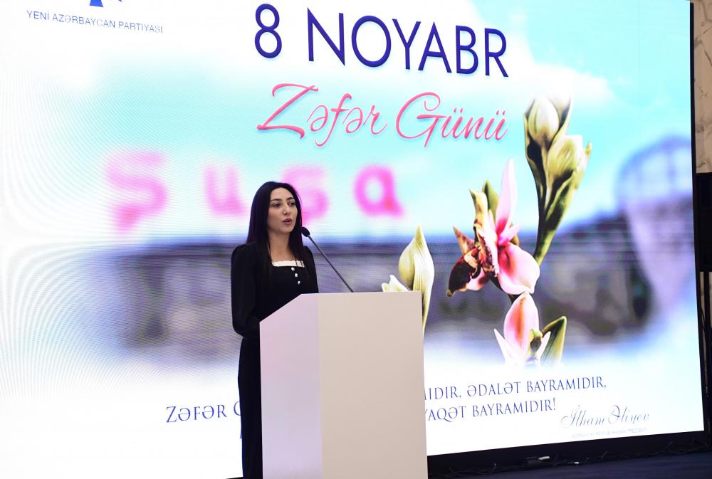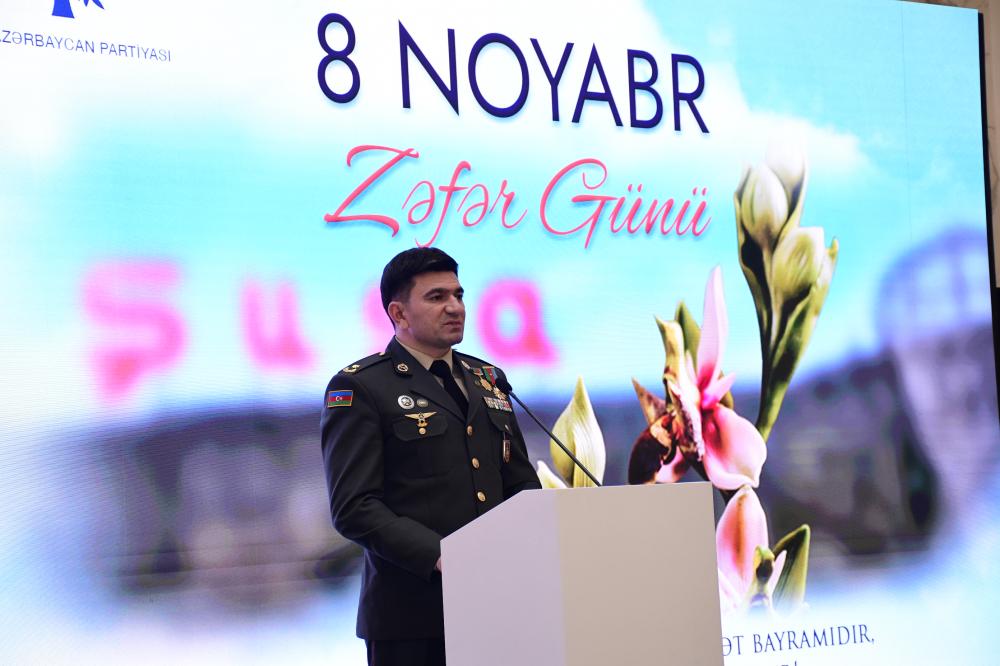 Tədbirdə çıxış edən Yeni Azərbaycan Partiyası Sədrinin müavini – Mərkəzi Aparatın rəhbəri Tahir Budaqov tədbir iştirakçılarını müasir dövlətçilik tariximizin ən qürurverici hadisəsi – zirvə nöqtəsi olan və Azərbaycanın ərazi bütövlüyünün bərpasını təmin edən şanlı Zəfərin dördüncü ildönümü münasibətilə salamlamaqdan böyük məmnunluq duyduğunu bildirib. Tahir Budaqov vurğulayıb ki, Azərbaycan xalqı torpaqlarımızın işğaldan azad olunmasının, əzəli yurd yerlərinə əbədi qayıdışının hədsiz sevinc və qürurunu yaşamaqla 8 Noyabr – Zəfər Gününü böyük coşqu ilə qeyd edir: “Əlbəttə, bu tarixi Qələbə heç də asanlıqla qazanılmamış, möhtəşəm Zəfərə gedən yol olduqca çətin və keşməkeşli olmuşdur. “Biz öz torpaqlarımızın sahibi olmalıyıq. Sülh yolu ilə məsələləri həll etməliyik. Nəyin bahasına olur-olsun, hansı yolla olur-olsun, Şuşa da, Qarabağ da, bütün işğal olunmuş torpaqlar azad olunacaq - Azərbaycan xalqının iradəsi, Azərbaycanın qəhrəman oğullarının şücaəti ilə azad olunacaq və Azərbaycanın ərazi bütövlüyü təmin olunacaq!”, - deyən Ulu Öndər Heydər Əliyevin ölkəmizə rəhbərliyi dövründə bu hədəfə çatmaq üçün məqsədyönlü addımlar atılmış, həm ölkə daxilində, həm də beynəlxalq miqyasda məqsədyönlü işlər görülərək Azərbaycanı böyük Zəfərə aparan yolun əsası qoyulmuşdur. Bu gün iftixarla qeyd edirik ki, torpaqlarımız döyüş meydanında Ümummilli Lider Heydər Əliyevin siyasi varisi – Azərbaycan Respublikasının Prezidenti, Müzəffər Ali Baş Komandan İlham Əliyevin rəhbərliyi ilə qüdrətli ordumuzun işğalçıları darmadağın edərək layiqincə cəzalandırması nəticəsində azad olunmuşdur. Eyni zamanda onu da xüsusi vurğulamaq lazımdır ki, Azərbaycanın öz ərazi bütövlüyü və suverenliyini bərpa etməsi müstəqillik illərində milli maraqlara əsaslanan qətiyyətli siyasətin məntiqi nəticəsidir”.