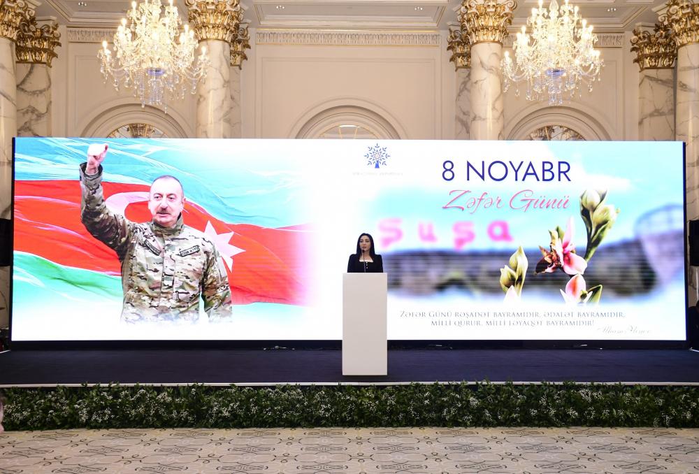 Xüsusi Təyinatlı Qüvvələrin giziri, “Qarabağ” ordenli şəhid Şahmar Mənəfovun həyat yoldaşı Bəyim Mənəfova çıxışında bildirib ki, Azərbaycan xalqı artıq 2020-ci ildən hər ilin noyabr ayını böyük sevinc və fərəh hissi ilə qarşılayır: “Çünki Ali Baş Komandanımızın rəhbərliyi, Azərbaycanın igid oğullarının misilsiz şücaəti sayəsində Qarabağ əzəli sahiblərinə geri qaytarıldı. 2020-ci ilin 27 sentyabrı bizi böyük Qələbəyə aparan yolun başlanğıcıdır. Məhz həmin gündən başlayaraq “Qarabağ Azərbaycandır!” deyərək haqq savaşına çıxdıq. Bütün dünyaya, beynəlxalq aləmə qüdrətli, əzəmətli Azərbaycan dövlətinin mövcudluğunu bir daha nümayiş etdirdik. Ölkə Prezidenti, Silahlı Qüvvələrin Müzəffər Ali Baş Komandanı İlham Əliyevin əzmi, iradəsi, qətiyyətli mövqeyi, Azərbaycan Ordusunun gücü, qüdrəti sayəsində bütün dünya qarşısında başqa bir Azərbaycanı gördü. Cəmi 44 gün davam edən haqq savaşımızda, Vətən müharibəsində şanlı Ordumuz elə bir Zəfər dastanı yazdı ki, bu tarixi qələbəmiz dostu sevindirdi, düşmənlərimizə isə göz dağı oldu”.