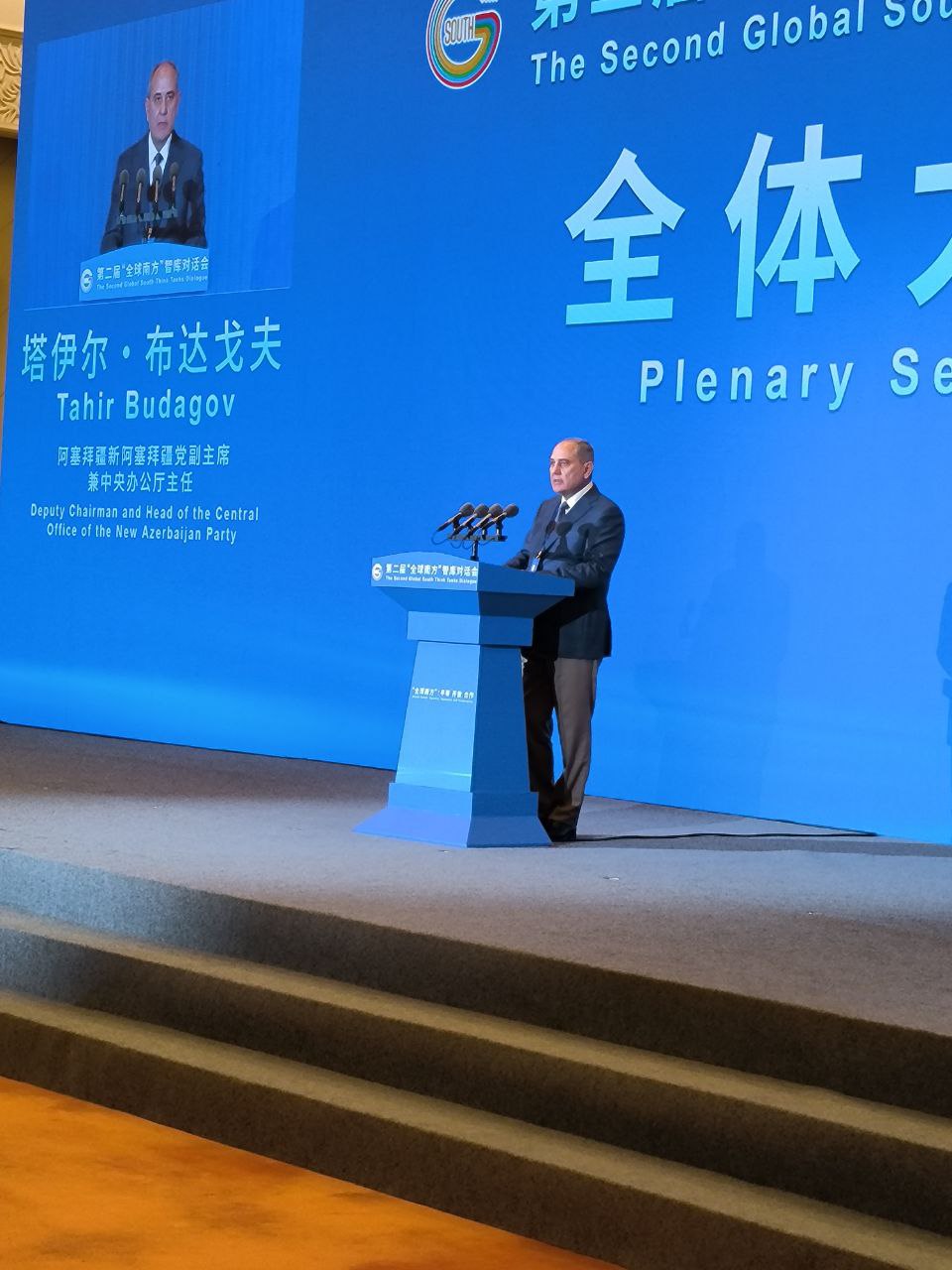 Plenar sessiyada nitq söyləyən YAP Sədrinin müavini – Mərkəzi Aparatın rəhbəri Tahir Budaqov Qlobal Cənub Beyin Mərkəzlərinin İkinci Dialoqunda çıxış etməkdən böyük məmnunluq duyduğunu diqqətə çatdırıb: “Bu gün burada, Nankində bir araya gəlməyimiz qlobal prioritetlərin formalaşmasında, bərabərliyə və inklüzivliyə əsaslanan dünyanın yaranmasında Qlobal Cənubun artan rolunu və təsirini əks etdirir”.