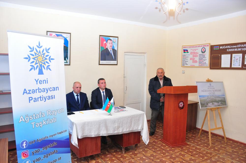 Tədbiri giriş sözü ilə açan “Muğanlı kənd” Ərazi Partiya Təşkilatının fəal üzvü Novruz Musayev qeyd edib ki, 44 günlük Vətən müharibəsində əldə etdiyimiz Qələbə nəticəsində imzalanmış Üçtərəfli Bəyanata əsasən, 2020-ci il noyabrın 20-də Ağdam rayonunun işğal olunmuş ərazisi Azərbaycana təhvil verildi. Ağdam şəhərinin və ona yaxın kəndlərin döyüşsüz Azərbaycana qaytarılması əlamətdar hadisə idi. Prezident İlham Əliyevin 31 iyul 2023-cü il tarixli “Azərbaycan Respublikasının işğaldan azad edilmiş əraziləri üzrə şəhər günlərinin təsis edilməsi haqqında” Sərəncamına əsasən, hər il noyabrın 20-də Ağdam Şəhəri Günü təntənəli şəkildə qeyd edilir.