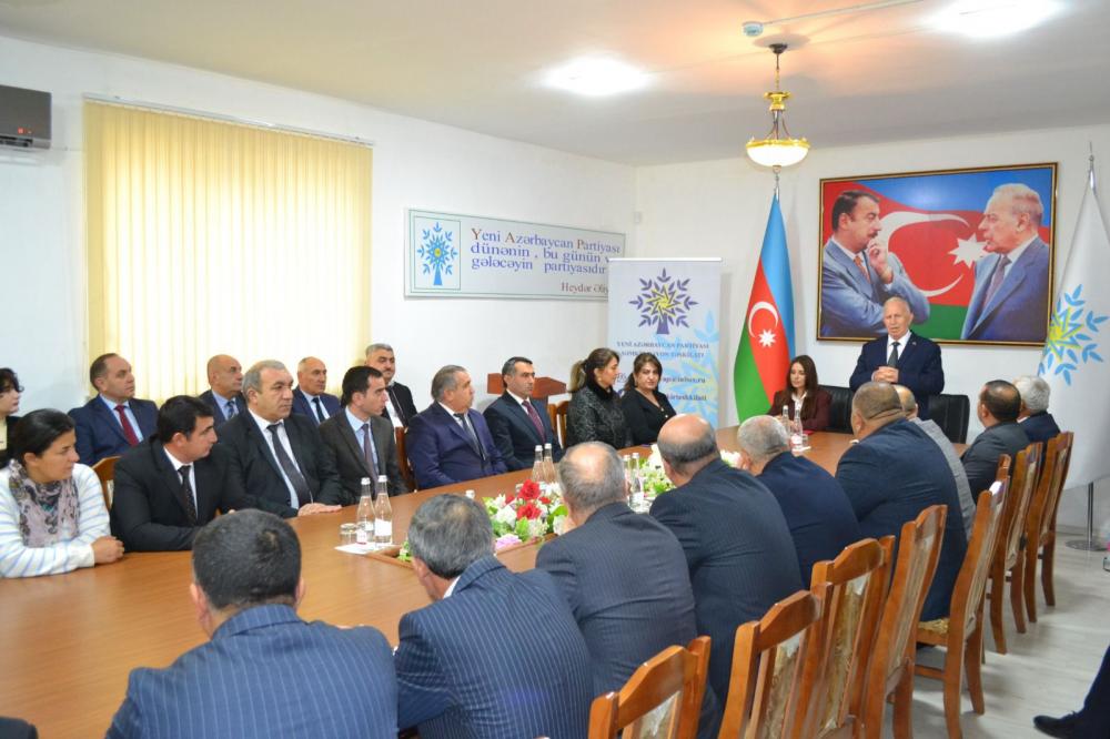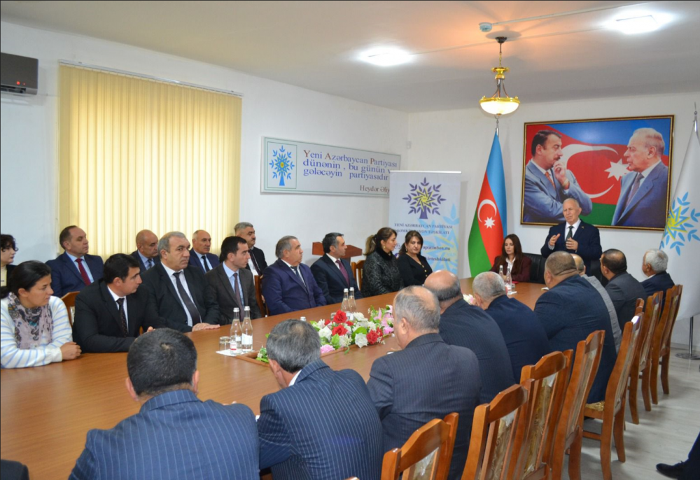 Sonra tədbiri giriş sözü ilə açan Yeni Azərbaycan Partiyası Şəmkir rayon təşkilatının sədri Fəxrəddin Vəliyev qeyd etmişdir ki, “Müasir Azərbaycan dövlətinin qurucusu, ölkəmizin milli dövlətçilik ənənələrinin qurulmasında və inkişafında misilsiz xidmətləri olan dahi rəhbər, Ümummilli Lider Heydər Əliyev tərəfindən müəyyənləşdirilən siyasi kurs bu gün ölkə Prezidenti cənab İlham Əliyev tərəfindən uğurla davam etdirilir. Cənab Prezident İlham Əliyev ölkəmizə rəhbərlik etdiyi bu illər ərzində Ulu Öndər Heydər Əliyevin ideyalarına və siyasi strategiyasına daim sadiq qalaraq, onları yeni çalarlarla və müasir dövrün tələblərinə uyğun şəkildə uğurla davam etdirir. 30 ilə yaxın davam edən Dağlıq Qarabağ münaqişəsi məhz Müzəffər Ali Baş Komandan cənab İlham Əliyevin qətiyyəti, cəsarəti və siyasi iradəsi sayəsində öz həllini tapıb. Bizə bu günləri yaşadan, tarixi Zəfərimizə imza atan cənab Prezidentə hər zaman minnətdarıq. Hazırda qarşıda dövlət başçısı cənab İlham Əliyevin rəhbərliyi ilə Qarabağda həyatı dirçəltmək, bərpa etmək kimi mühüm və şərəfli bir vəzifə dayanır.