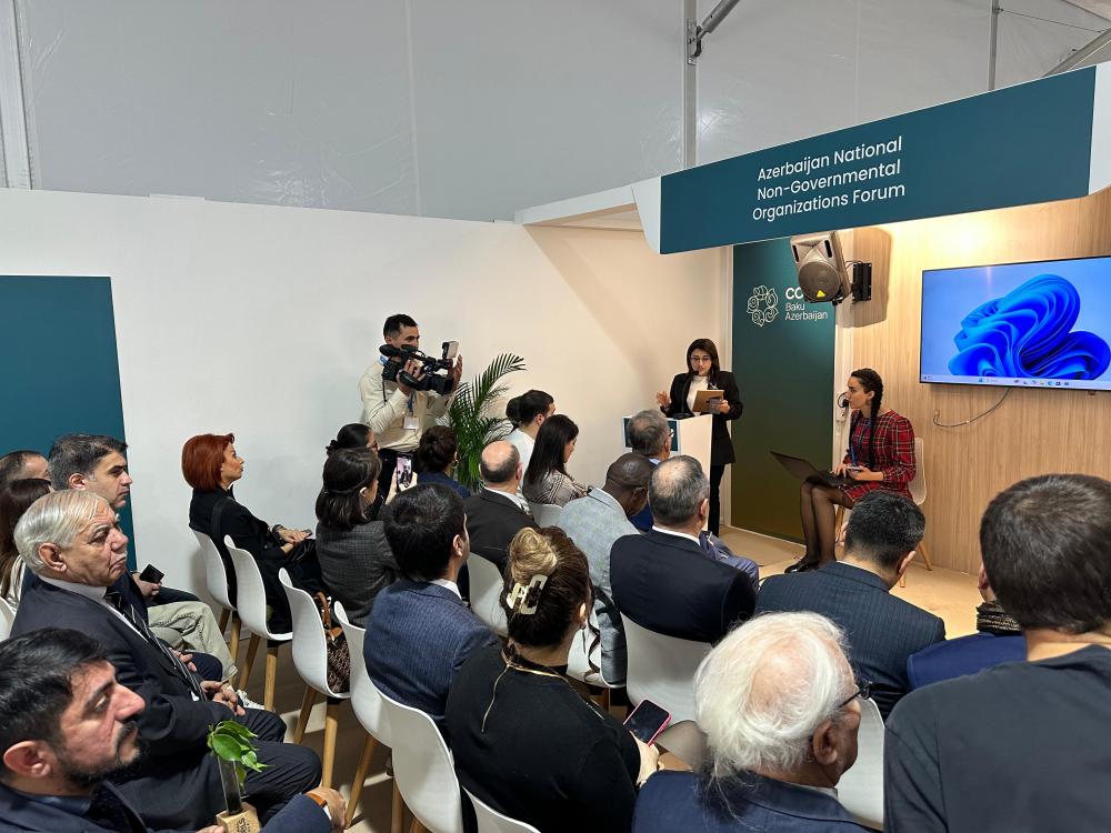 Yaşıl zonada Milli QHT Forumunun pavilyonunda keçirilən tədbirdə yerli ekspertlərdən BDU-nun Hüquq fakültəsinin professoru Əfsər Sadıqov, politoloq Anar Əliyev, Qida təhlükəsizliyi hərəkatının rəhbəri, ekoaktivist Məhsəti Hüseynova, qafqazşünas-alim Elnur Kəlbizadə xarici ekspertlərdən isə layihənin tərəfdaşı olan Konqo Respublikasından gəlmiş BMT UNFCC-nin üzv təşkilatının sədri Makuantsi Artur Patrisi, Almaniyadan tibb elmləri doktoru Rahim Şmit, həmçinin mühəndis, texniki elmləri doktoru “Şeffer” şirkətlər qrupunun vitse-prezidenti Yaşar Musayev, Pakistandan ictimai fəallar, ekoaktivistlər Ali Raza, Ənvər-ül Haqq və Şri-Lankadan Nayana Adıkari çıxış ediblər.