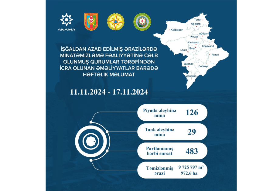 ANAMA-dan AZƏRTAC-a bildirilib ki, noyabrın 11-dən noyabrın 17-dək Tərtər, Ağdərə, Kəlbəcər, Ağdam, Xocalı, Xankəndi, Xocavənd, Laçın, Şuşa, Füzuli, Qubadlı, Cəbrayıl və Zəngilan ərazilərində aparılmış minatəmizləmə əməliyyatları zamanı piyadaəleyhinə 126, tankəleyhinə 29 mina və 483 partlamamış hərbi sursat aşkarlanaraq zərərsizləşdirilib. Bununla yanaşı, ötən həftə 972,6 hektar ərazi mina və partlamamış hərbi sursatdan təmizlənib.